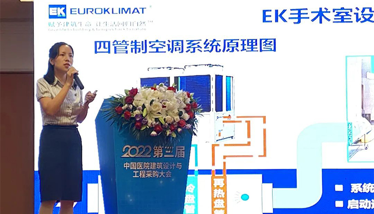 大會現(xiàn)場,EK空調(diào)水系統(tǒng)產(chǎn)品經(jīng)理呂芳玉以《EK熱回收系統(tǒng)與您攜手共建環(huán)境友好型醫(yī)院》為主題發(fā)表演講。呂芳玉以廈門大學附屬翔安醫(yī)院為例,和大家詳細介紹了EK節(jié)能空調(diào)設備在不同醫(yī)院場景的應用。